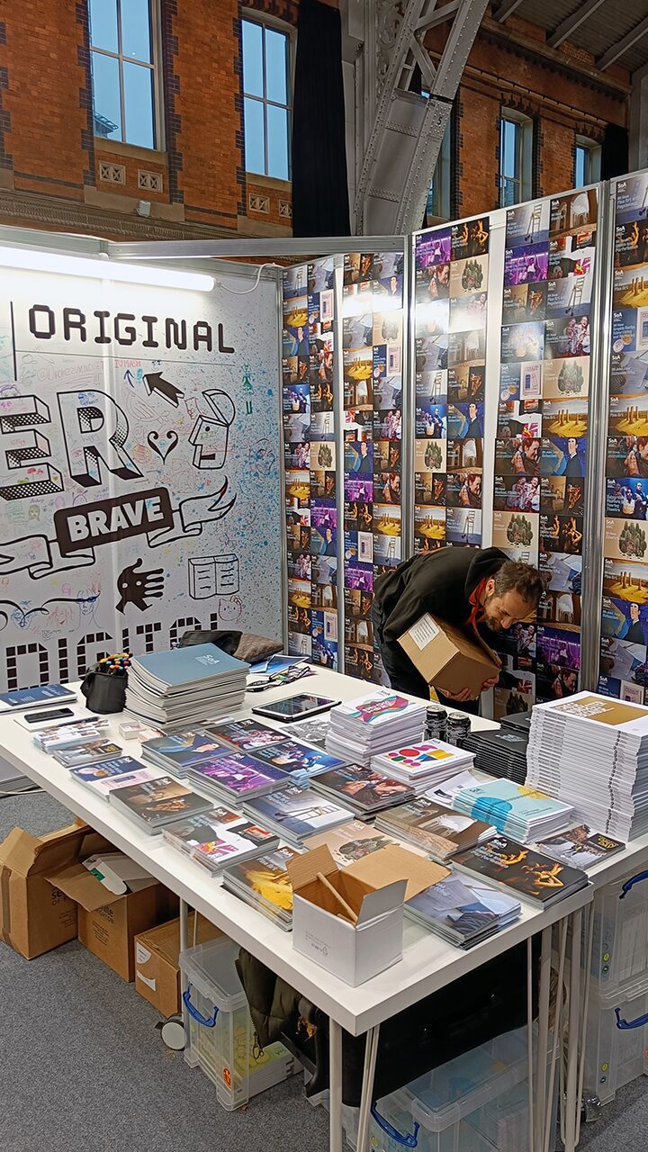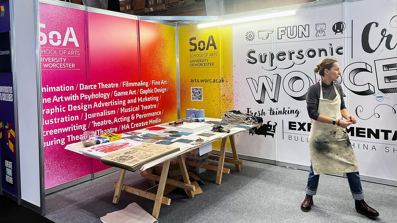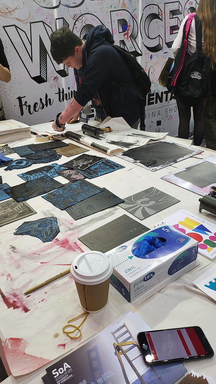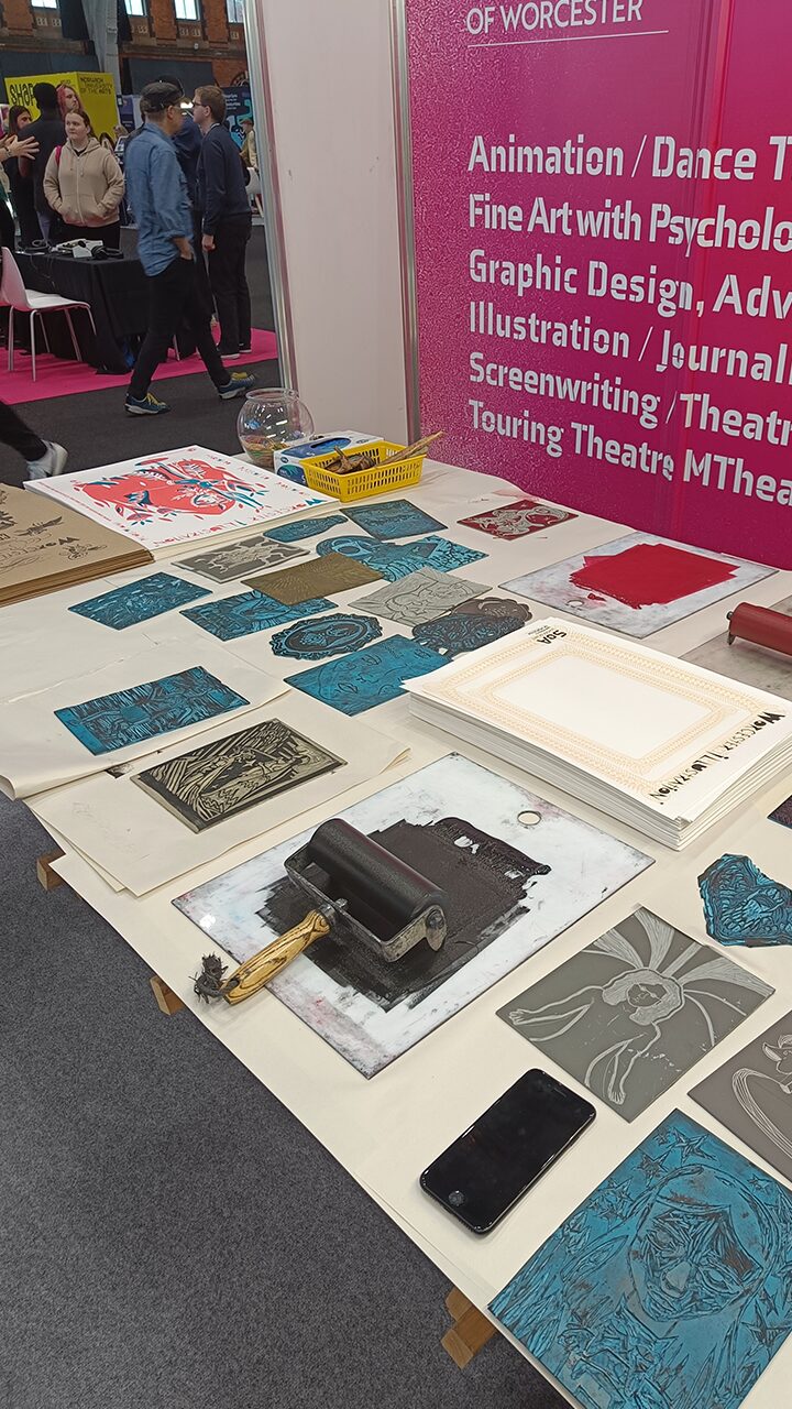 This year’s theme was to identify Worcester with inspiring words on the banner. We really leant into the interactivity this year after last year’s success, with the entire banner being open for people to come and draw on. We also had a live printmaking station, in which visitors were invited to create their own lino-printed posters that they were able to take back with them. We received many compliments for our stand design, both from students and other Universities, many of whom were delighted at the opportunity to draw on the walls.